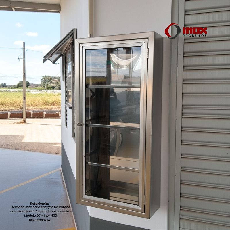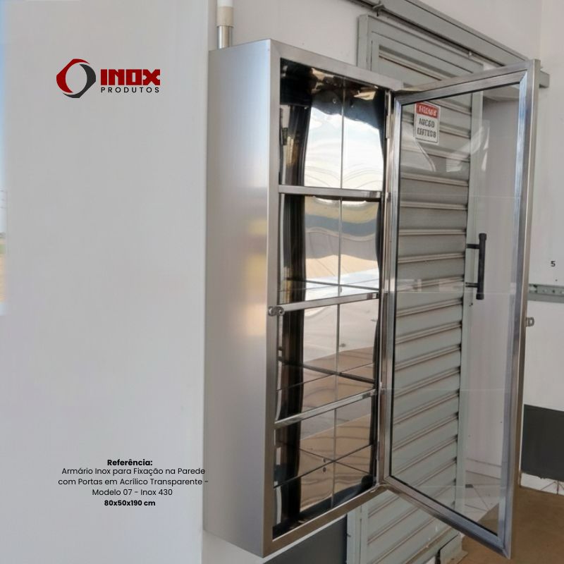 Armário de aço inox para fixação na parede, fabricado sob medida, com portas em acrílico transparente que permitem fácil visualização do conteúdo. Versátil e multiuso, é ideal para cozinhas industriais, clínicas, laboratórios, áreas hospitalares, ambientes industriais, postos de combustíveis e diversos outros espaços profissionais. Resistente à corrosão, higiênico e de fácil limpeza, oferece organização, durabilidade e alto padrão sanitário.