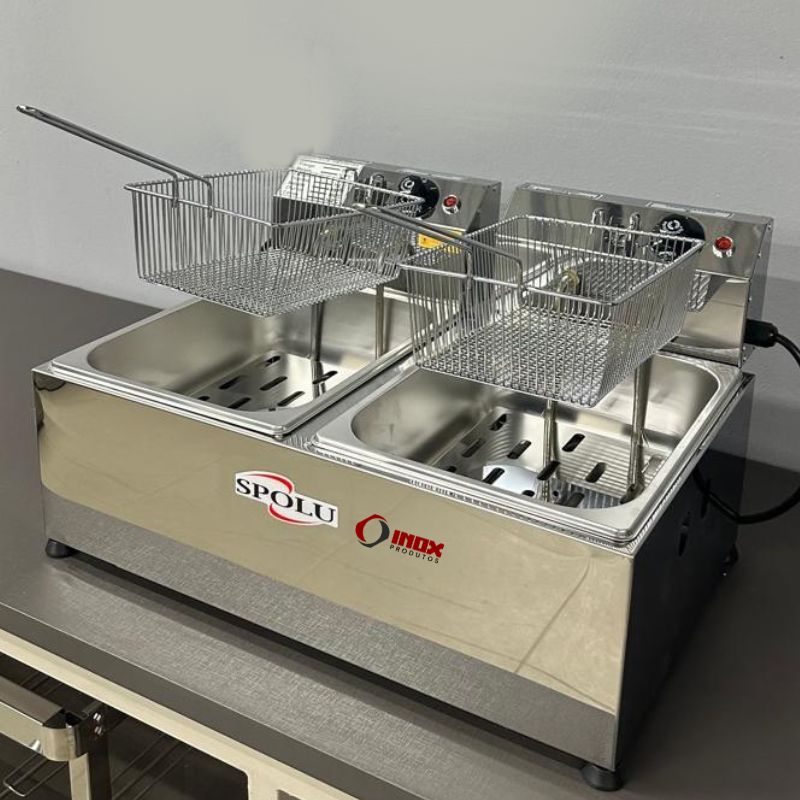 Fritadeira elétrica industrial em inox 430 com 2 cubas independentes, aquecimento eficiente e controle de temperatura.