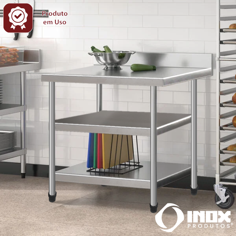 Mesa Inox com Frontão e 2 Prateleiras Lisas - Modelo 26 - Inox 430 - 70x60x90 cm