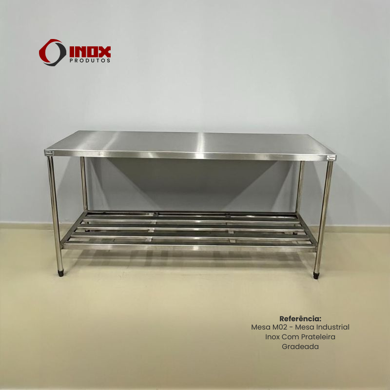 Mesa Inox com Prateleira Gradeada - Modelo 02 - Inox 430 - 120x60x90 cm