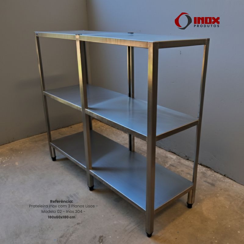 Prateleira Inox com 3 Planos Lisos - Modelo 02 - Inox 304 - 180x60x180 cm
