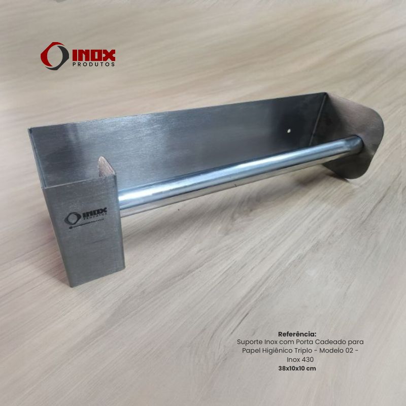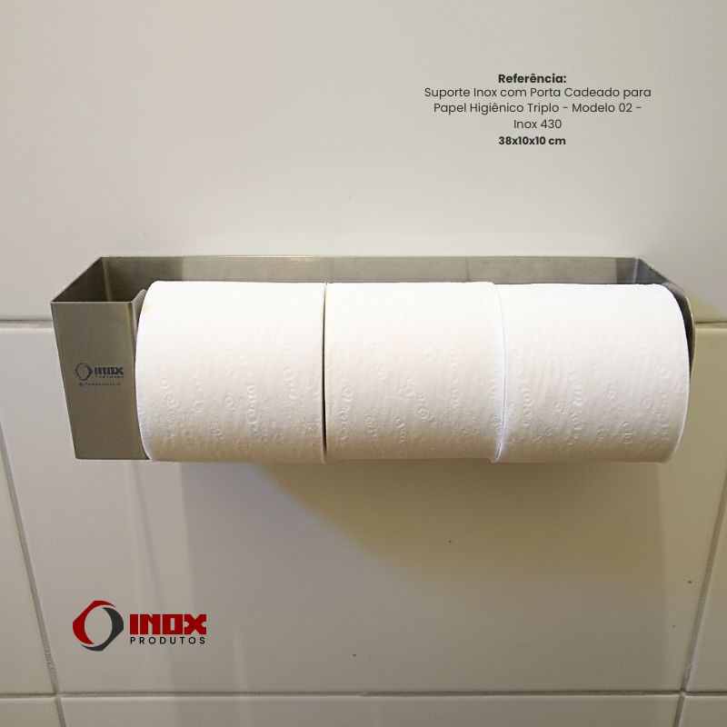 Suporte Inox com Porta Cadeado para Papel Higiênico Triplo - Modelo 02 - Inox 430 - 38x10x10 cm